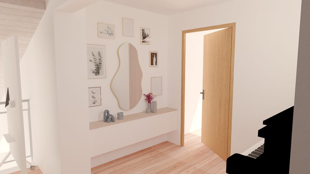Ici le pallier a été aménagé avec un meuble sur mesure, des cadres et un miroir pour accéder aux chambre tout en étant fonctionnel